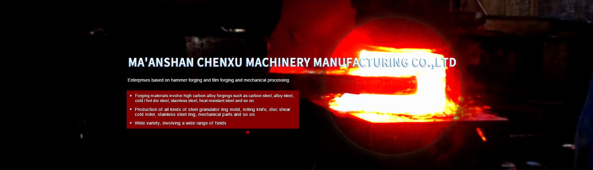 Maanshan chen-xu machinery manufacturing co., LTD., founded in 2003, is located in maanshan city, looking at the area city industrial park, is a on free forging hammer forging and machining of membranes and the leading enterprises, the company has 3 tons and 1 ton, 200 kg, 750 kg equipment forging ability range of forgings and forging of membranes and relatively complete mechanical processing equipment, forging steel grade carbon steel, alloy steel, cold and hot die steel, stainless steel, heat-resistant steel and other high alloy steel forging, as well as the production of various steel grade pelletizer ring die, rolling cutter, yuan plate shear cold roll, stainless steel ring, flange and complete sets of equipment, machinery spare parts, etc. The p...